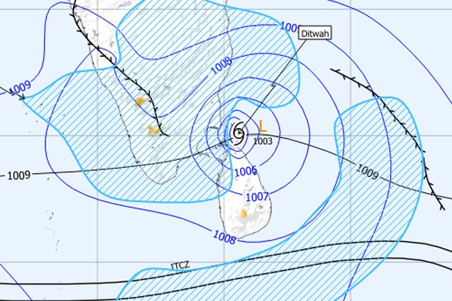 “දිට්වා” Ditwah සුළිකුණාටුව කන්කසන්තුරය සිට 210 km ක් ඊසාන දෙසින්,