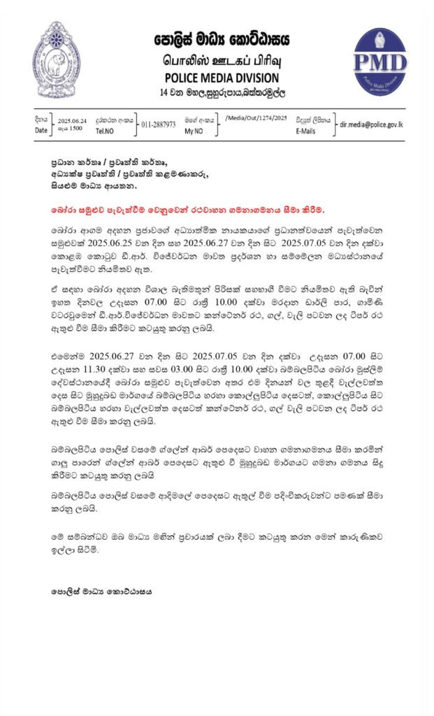 කොළඹ, 2024 ජූනි 24 – බෝරා ආගමික සමුළුව සඳහා සූදානම් වන අතරතුර, කොළඹ ආශ්‍රිත ප්‍රදේශවල රථවාහන ගමනාගමනය සීමා කිරීමට පොලිස් මාධ්‍ය කොට්ඨාසය විසින් නිවේදනයක් නිකුත් කර ඇත.