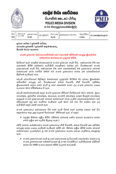 ජංගම දුරකථන අස්ථානගතවීමකදී හෝ සොරකම් කිරීමකදී ගතයුතු ක්රියාමාර්ග පිළිබඳව පොලීසිය විසින් මහජනතාව වෙත දැනුම්දීමක් සිදුකර ඇත.