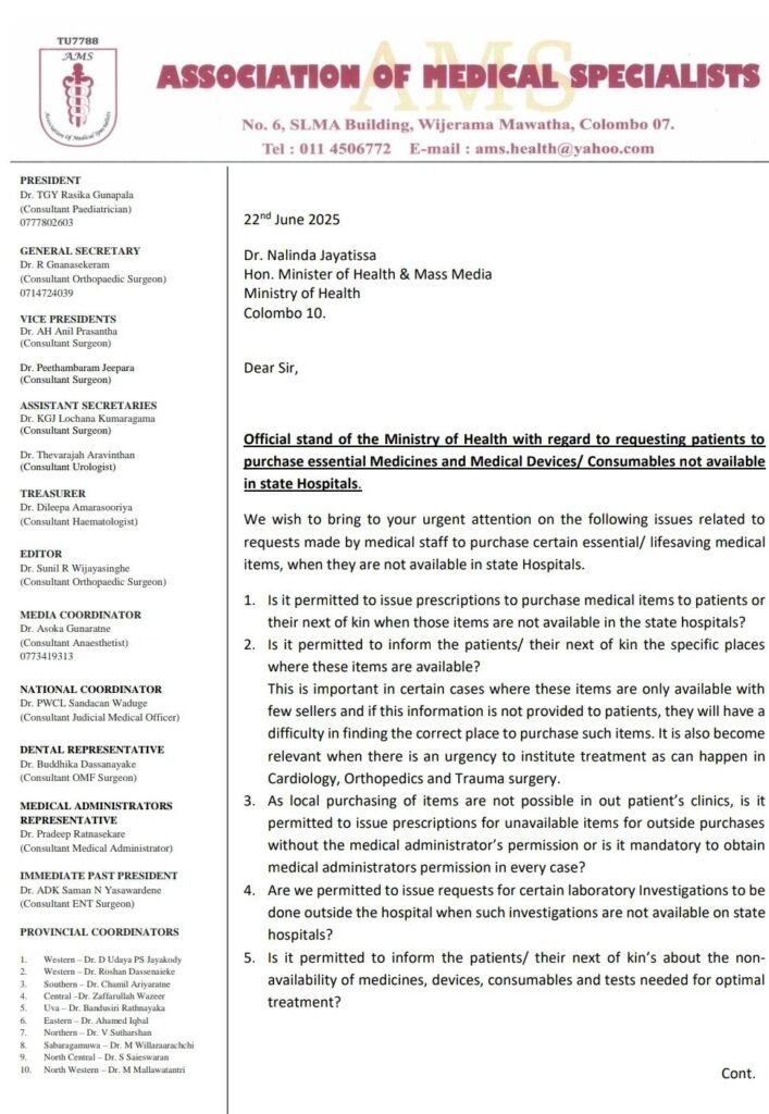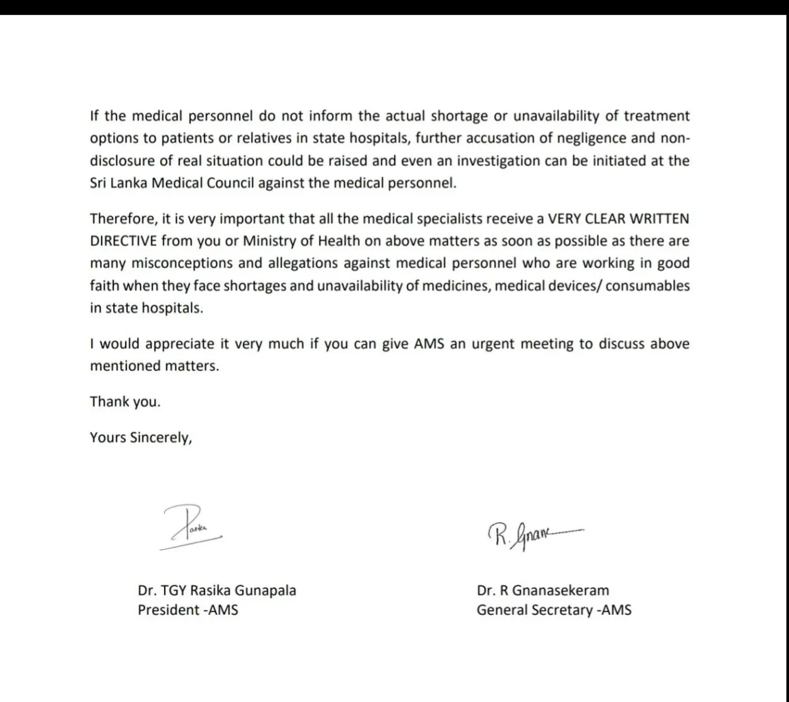 එබැවින්, රාජ්‍ය රෝහල්වල ඖෂධ, වෛද්‍ය උපකරණ/පරිභෝජන ද්‍රව්‍ය හිඟතා සහ නොමැතිකම හමුවේ අවංකව කටයුතු කරන වෛද්‍ය නිලධාරීන්ට එරෙහිව පවතින බොහෝ වැරදි වැටහීම් සහ චෝදනා හේතුවෙන්, ඉහත කරුණු සම්බන්ධයෙන් ඔබගෙන් හෝ සෞඛ්‍ය අමාත්‍යාංශයෙන් ඉතා පැහැදිලි ලිඛිත නියෝගයක් හැකි ඉක්මනින් සියලුම වෛද්‍ය විශේෂඥයින්ට ලැබීම ඉතා වැදගත් වේ.