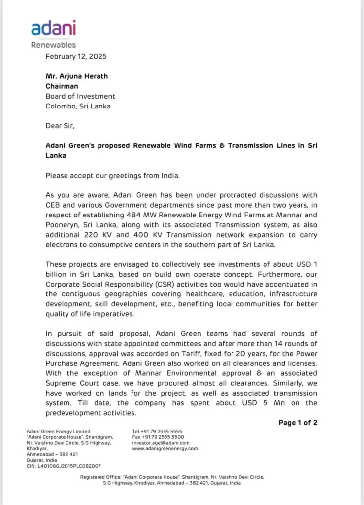 මන්නාරම් දිස්ත්රික්කයේ සුලං බලාගාර ප්රතිස්ථාපනය කිරීමේ ව්යාපෘතිය ශ්රී ලංකා රජය සහ ඉන්දියානු අදානි සමාගම අතර ගිවිසුමකට අනුව ආරම්භ විය. කෙසේ වෙතත්, ව්යාපෘතියේ ක්රියාකාරීත්වය සහ පාරිසරික බලපෑම් පිළිබඳව ප්රශ්න රැසක් මතු වී තිබූ අතර, මෙම තීරණය ඒ හා සම්බන්ධ විය හැකි බව විශ්ලේෂකයින් පෙන්වා දෙයි.