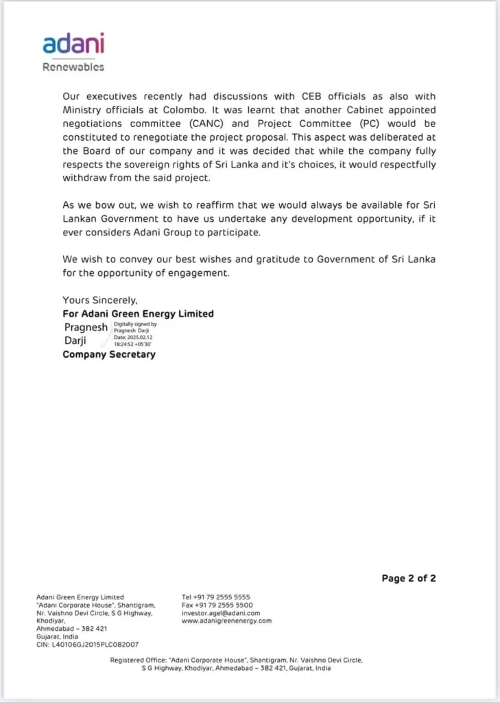 මන්නාරමේ සුලං බලාගාර ව්යාපෘතියෙන් අදානි සමාගම ඉවත් වී ඇති බව වාර්තා වේ. මෙම තීරණය ගෙන ඇත්තේ ව්යාපෘතියේ ප්රගතිය සහ අනාගත අභියෝග සම්බන්ධයෙන් ඇති අසහනය හේතුවෙන් බව පැවසේ.