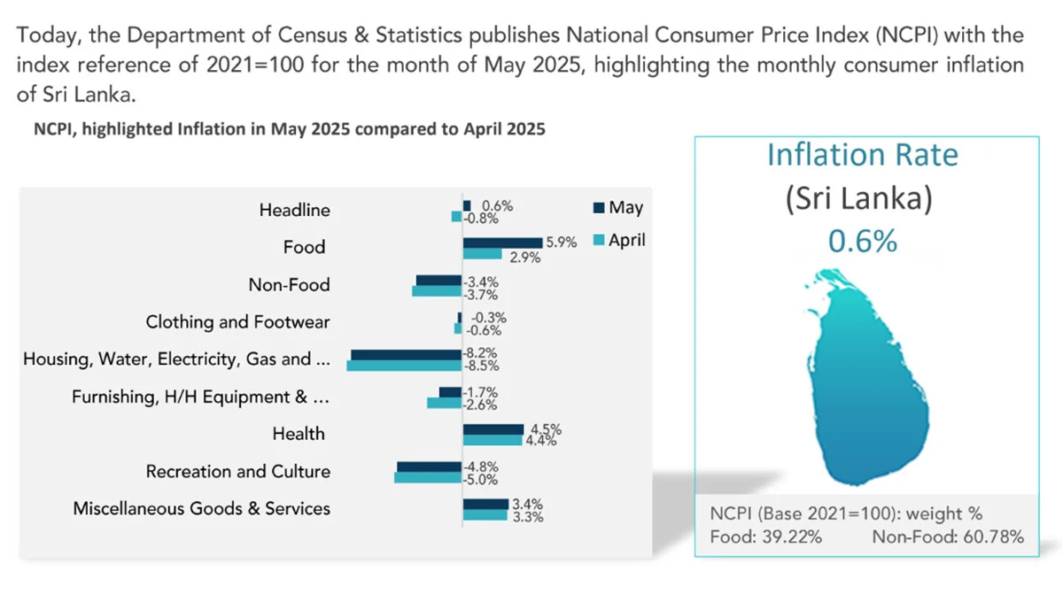 කොළඹ, ජුනි 2025 – ජනලේඛන සහ සංඛ්යාලේඛන දෙපාර්තමේන්තුව විසින් 2025 මැයි මාසය සඳහා ප්රකාශයට පත් කරන ලද නවතම ජාතික පාරිභෝගික